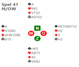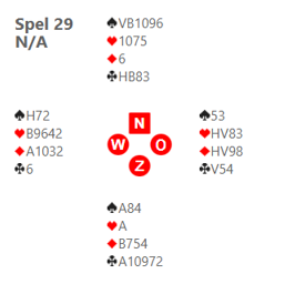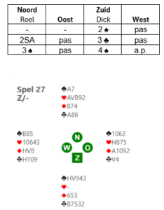 Dick liet op spel 27 zien dat je nooit moet opgeven, ook al zit je in een kansloos contract, er is altijd hoop. Dick opende 2♠ (Muiderberg: 5-kaart schoppen en minstens een 4-kaart in een lage kleur). Mijn 2SA is een vraagbod. Dick geeft als zuid aangegeven dat hij een lichte 2♠ opening heeft met minstens een 4-kaart ♣. Ik bood 3♠ als eindbod, maar Dick maakte er toch nog 4♠ van, omdat hij dacht dat er wel een fit was en vanwege zijn 5-kaart klaveren. De volledige bieding en het spel: