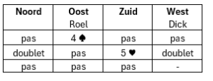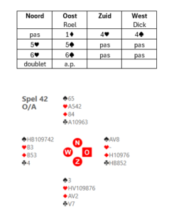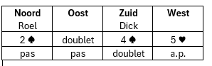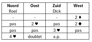 Wat doe je als je partner kwetsbaar 2♠ (Muiderberg) opent en oost doublet heeft gezegd? We hebben afgesproken om degelijke zwakke openingen te spelen. Met de zuidhand zijn er een aantal opties na de Muiderberg opening: 2SA (vraagbod; ben je sterk of zwak); 3♦ (vraagbod; partner als je een goede hand hebt, bied dan 4♠; 3♠ (barrage); 4♠ (je hebt een mooie hand, kort in harten en aansluiting in de lage kleur van partner). Dick kiest voor het laatste en biedt 4♠. Hij heeft weliswaar 3 azen, die 3 slagen opleveren, maar 4♠ heeft ook goede kansen. West gaat in de denktank en biedt 5♥. Dick doubleert uiteraard (5♠ is te dol). De tegenstanders zijn kwetsbaar. Het hele biedverloop:
