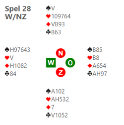 Het biedverloop op het hierna volgende spel 28 gaat als volgt. Ik heb de volgende hand.