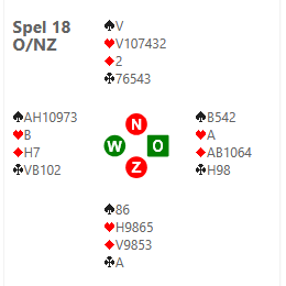 Inderdaad bleken de tegenstanders een misverstand te hebben. Links dacht dat zijn pas 2 azen aangaf, rechts dacht 1 aas. Ze misten nu het slem. Toch scoorde dit voor ons maar 43%, omdat er nogal wat paren in de deelscore zaten, of er niet in slaagden 12 slagen te maken. Maar ja, zonder het 5♥ bod, zouden ze zeker het slem geboden hebben en dan zouden we er een procentje of vijf aan overgehouden hebben.
